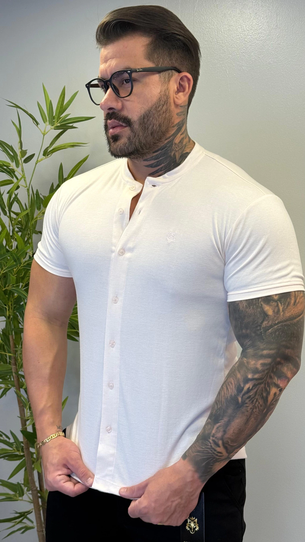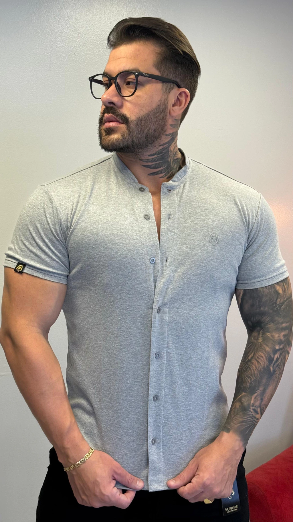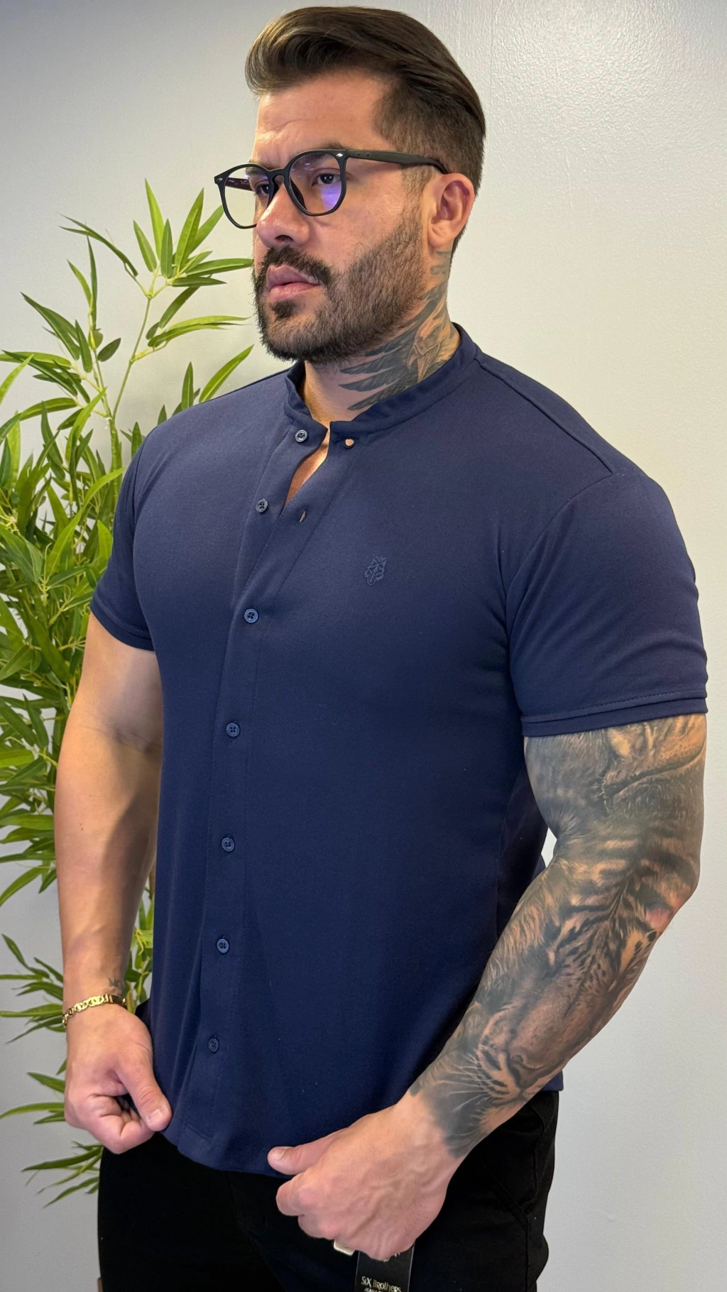 Modelagem ajustada que proporciona um caimento sofisticado e imponente, destacando o estilo moderno da gola padre com abertura em botões. Ideal para compor looks casuais elegantes, mantendo conforto e liberdade de movimento.